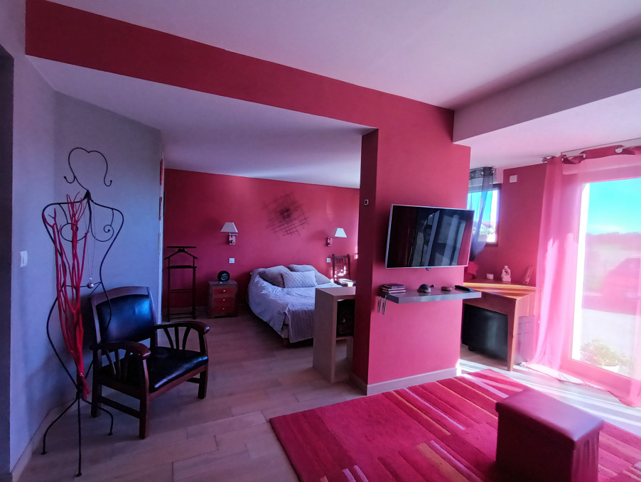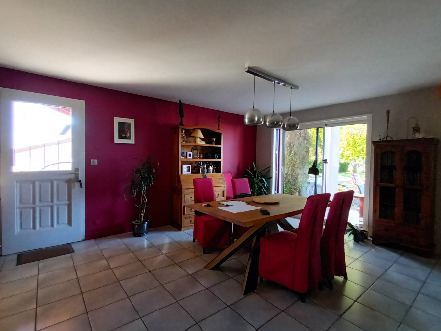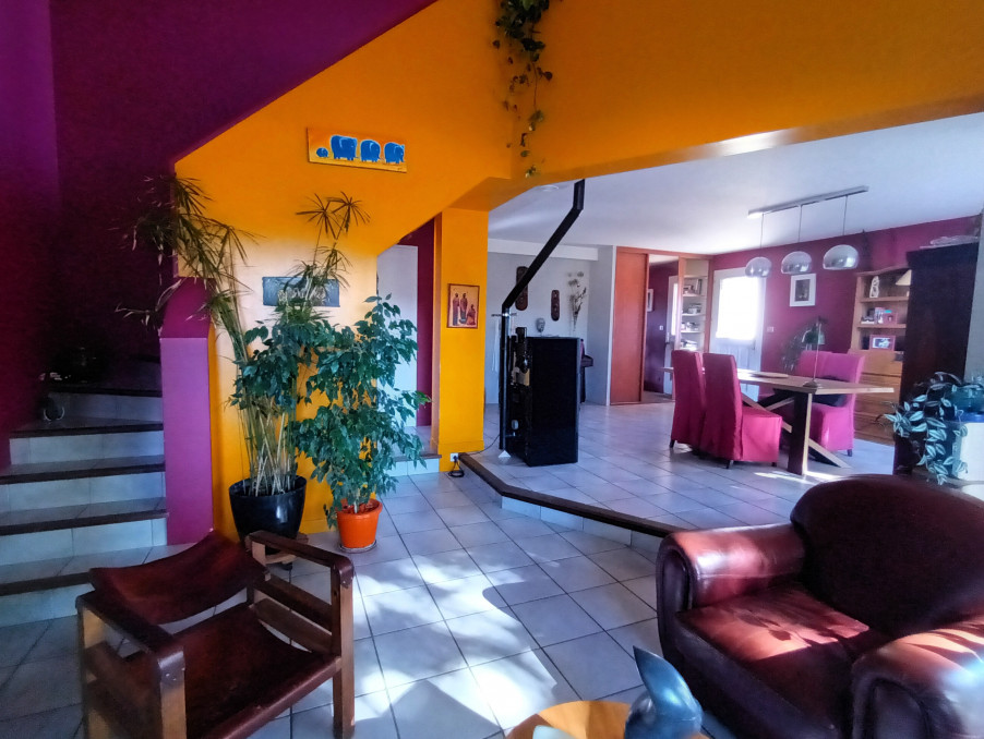 Le salon salle à manger de 43 m², avec sa cheminée, est l'endroit parfait pour se retrouver en famille ou entre amis. Vous pourrez profiter d'un environnement calme et paisible, en pleine campagne, tout en étant à seulement 10 minutes de Saint André de Corcy.
