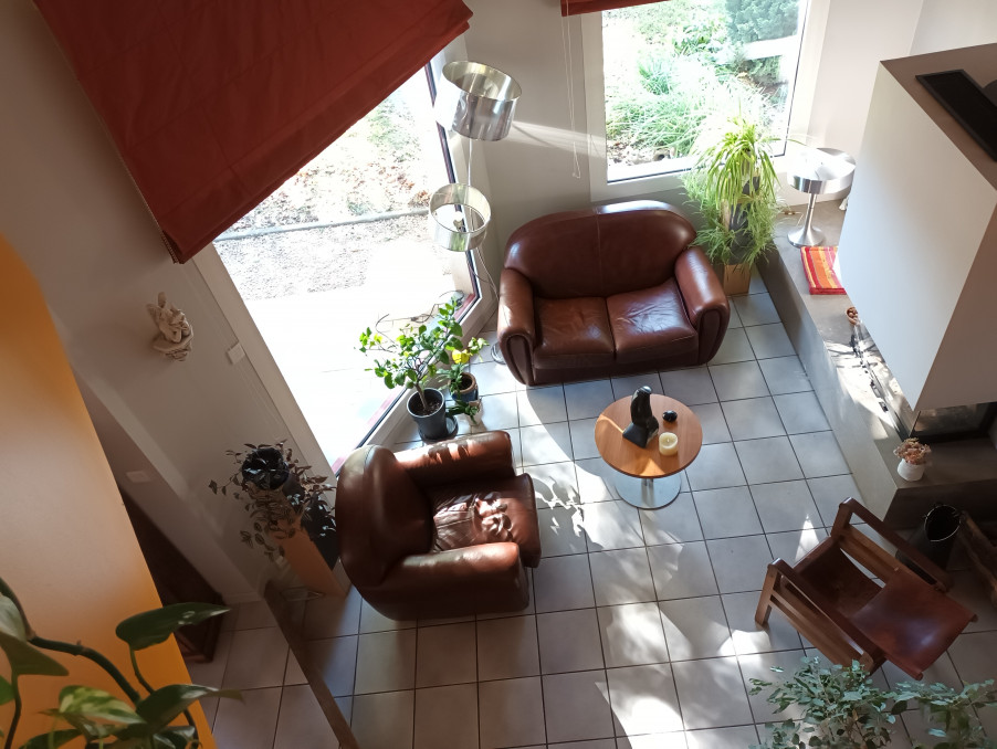 Les trois chambres situées à l'étage offrent également un espace confortable pour toute la famille. Le rez-de-chaussée dispose d'une dalle chauffante, d'une cheminée et d'un poêle à granulés, vous garantissant une agréable chaleur en hiver.